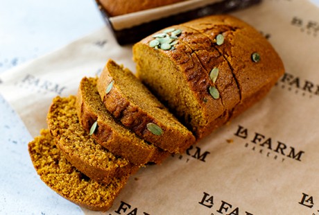 This moist pumpkin bread is made with a winning combination of fall spices and topped with toasted pumpkin seeds. Our most popular sweetbread during the holidays!