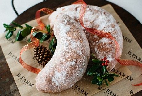 Traditionally known as a German holiday bread. Our stollen is from the Alsace Region in France. We soak raisins, orange strips, lemon zest and toasted almonds in rum then roll them into a incredible sweet dough. Then our bakers pipe a strip of almond paste through the interior, coat the bread in melted European butter and toss in sugar. Incroyable (Incredible)!!!